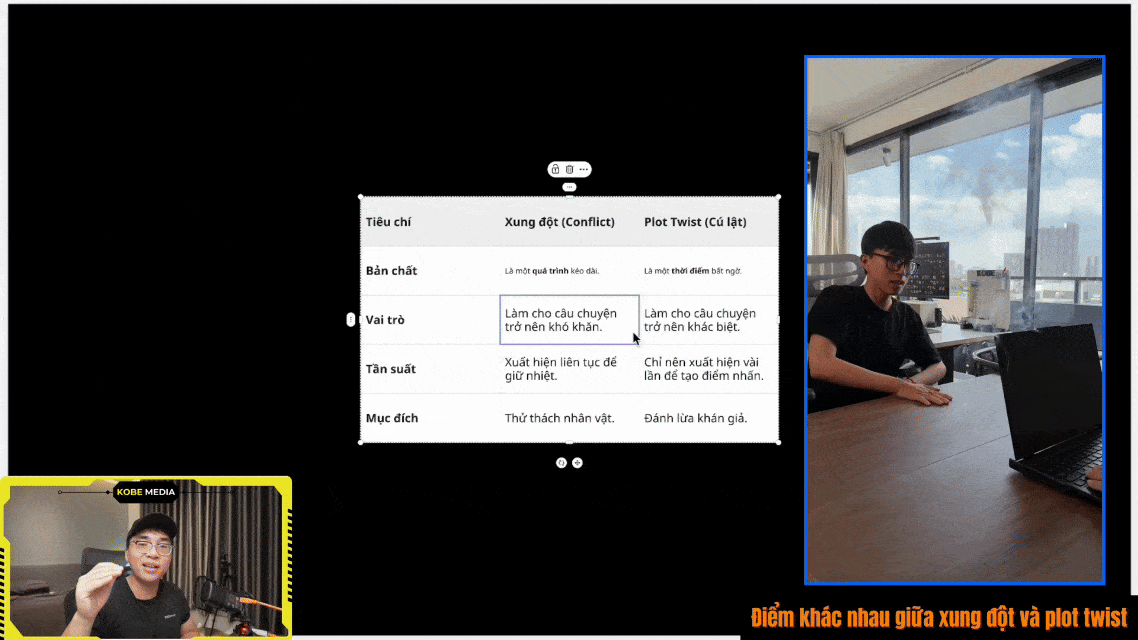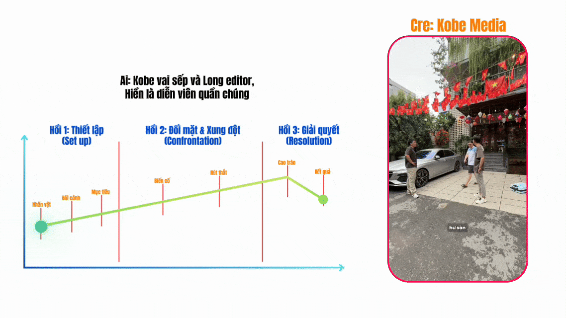 Trực tiếp phân tích cấu trúc kịch bản và các yếu tố cốt lõi tạo nên hàng loạt video bùng nổ của kênh Kobe Media. Nắm vững kỹ thuật phân định giữa “Xung đột” và “Plot Twist” để bẻ lái câu chuyện, đẩy cao trào kịch bản. Làm chủ công thức “Connecting the Dots” để liên kết các tình tiết thành một kịch bản hoàn chỉnh.